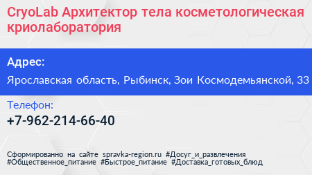 CryoLab Архитектор тела, косметологическая криолаборатория по адресу Ярославская область, Рыбинск, Зои Космодемьянской, 33 в дальнейшем Организация, размещена в следующих категориях:
