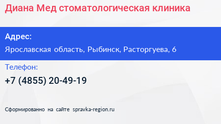 Диана-Мед, стоматологическая клиника по адресу Ярославская область, Рыбинск, Расторгуева, 6 в дальнейшем Организация, размещена в следующих категориях: