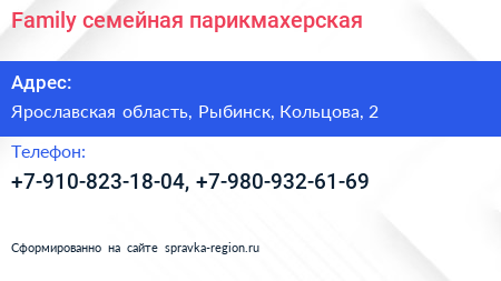 Family, семейная парикмахерская по адресу Ярославская область, Рыбинск, Кольцова, 2 в дальнейшем Организация, размещена в следующих категориях: