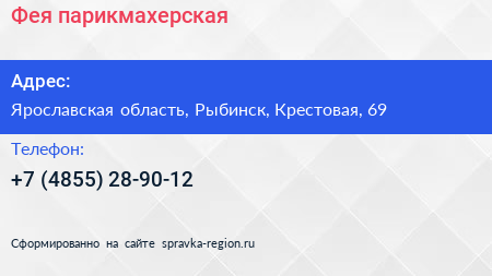 Фея, парикмахерская по адресу Ярославская область, Рыбинск, Крестовая, 69 в дальнейшем Организация, размещена в следующих категориях:
