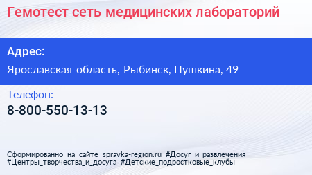 Гемотест, сеть медицинских лабораторий по адресу Ярославская область, Рыбинск, Пушкина, 49 в дальнейшем Организация, размещена в следующих категориях: