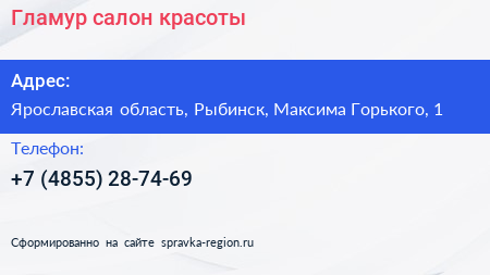 Гламур, салон красоты по адресу Ярославская область, Рыбинск, Максима Горького, 1 в дальнейшем Организация, размещена в следующих категориях: