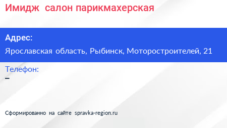 Имидж+, салон-парикмахерская по адресу Ярославская область, Рыбинск, Моторостроителей, 21 в дальнейшем Организация, размещена в следующих категориях: