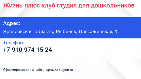 Жизнь плюс, клуб-студия для дошкольников по адресу Ярославская область, Рыбинск, Пассажирская, 1 в дальнейшем Организация, размещена в следующих категориях: