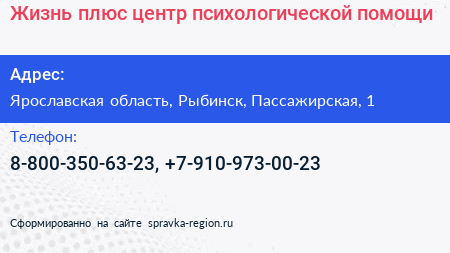 Жизнь плюс, центр психологической помощи по адресу Ярославская область, Рыбинск, Пассажирская, 1 в дальнейшем Организация, размещена в следующих категориях: