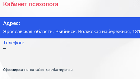 Кабинет психолога по адресу Ярославская область, Рыбинск, Волжская набережная, 131 в дальнейшем Организация, размещена в следующих категориях: