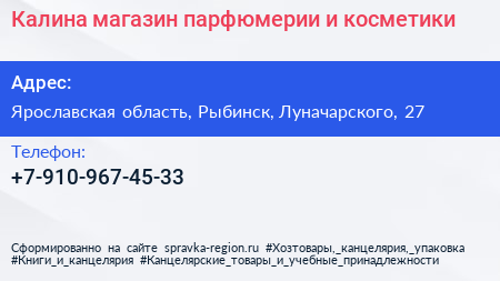 Калина, магазин парфюмерии и косметики по адресу Ярославская область, Рыбинск, Луначарского, 27 в дальнейшем Организация, размещена в следующих категориях: