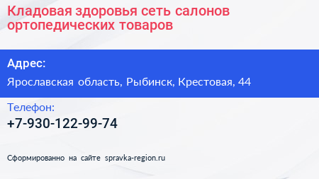 Кладовая здоровья, сеть салонов ортопедических товаров по адресу Ярославская область, Рыбинск, Крестовая, 44 в дальнейшем Организация, размещена в следующих категориях: