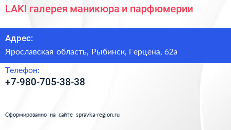 LAKI, галерея маникюра и парфюмерии по адресу Ярославская область, Рыбинск, Герцена, 62а в дальнейшем Организация, размещена в следующих категориях: