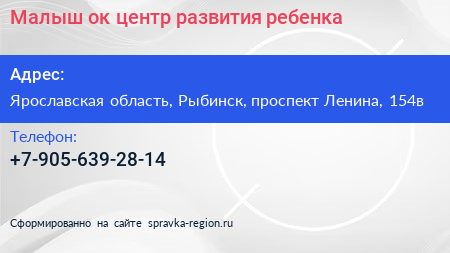 Малыш`ок, центр развития ребенка по адресу Ярославская область, Рыбинск, проспект Ленина, 154в в дальнейшем Организация, размещена в следующих категориях: