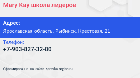 Mary Kay, школа лидеров по адресу Ярославская область, Рыбинск, Крестовая, 21 в дальнейшем Организация, размещена в следующих категориях: