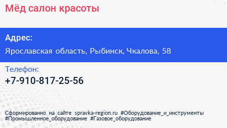 Мёд, салон красоты по адресу Ярославская область, Рыбинск, Чкалова, 58 в дальнейшем Организация, размещена в следующих категориях: