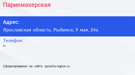 Парикмахерская по адресу Ярославская область, Рыбинск, 9 мая, 24а в дальнейшем Организация, размещена в следующих категориях: