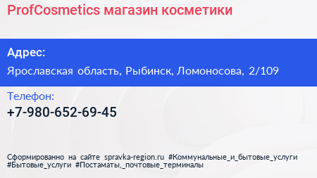 ProfCosmetics, магазин косметики по адресу Ярославская область, Рыбинск, Ломоносова, 2/109 в дальнейшем Организация, размещена в следующих категориях: