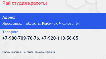 Рай, студия красоты по адресу Ярославская область, Рыбинск, Чкалова, 64 в дальнейшем Организация, размещена в следующих категориях: