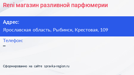 Reni, магазин разливной парфюмерии по адресу Ярославская область, Рыбинск, Крестовая, 109 в дальнейшем Организация, размещена в следующих категориях: