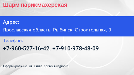 Шарм, парикмахерская по адресу Ярославская область, Рыбинск, Строительная, 3 в дальнейшем Организация, размещена в следующих категориях: