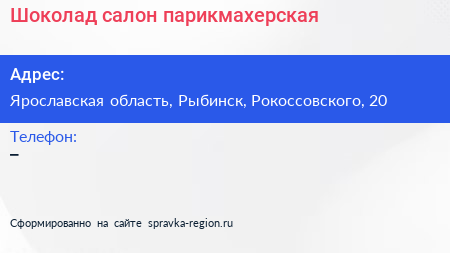 Шоколад, салон-парикмахерская по адресу Ярославская область, Рыбинск, Рокоссовского, 20 в дальнейшем Организация, размещена в следующих категориях: