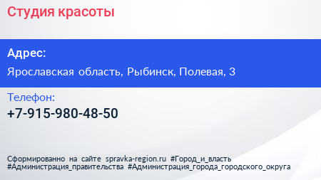 Студия красоты по адресу Ярославская область, Рыбинск, Полевая, 3 в дальнейшем Организация, размещена в следующих категориях: