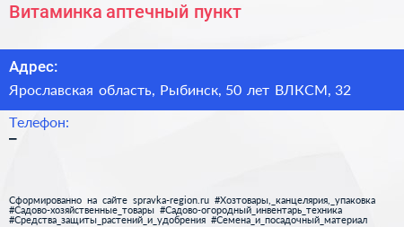 Витаминка, аптечный пункт по адресу Ярославская область, Рыбинск, 50 лет ВЛКСМ, 32 в дальнейшем Организация, размещена в следующих категориях: