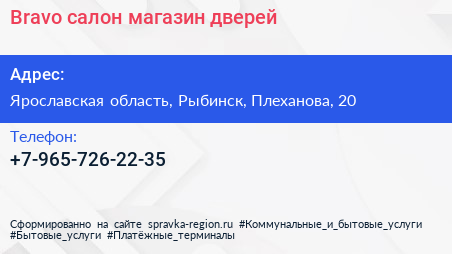 Bravo, салон-магазин дверей по адресу Ярославская область, Рыбинск, Плеханова, 20 в дальнейшем Организация, размещена в следующих категориях: