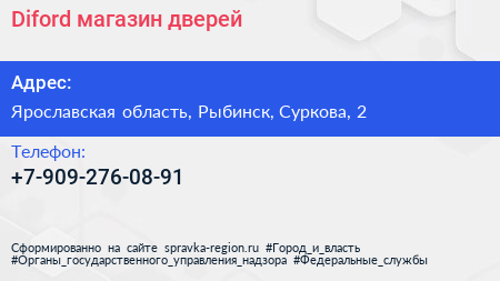 Diford, магазин дверей по адресу Ярославская область, Рыбинск, Суркова, 2 в дальнейшем Организация, размещена в следующих категориях: