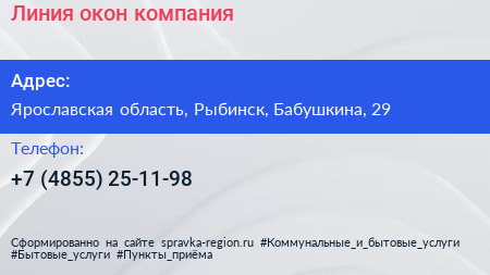 Линия окон, компания по адресу Ярославская область, Рыбинск, Бабушкина, 29 в дальнейшем Организация, размещена в следующих категориях: