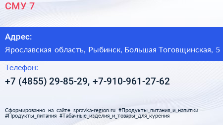 СМУ-7 по адресу Ярославская область, Рыбинск, Большая Тоговщинская, 5 в дальнейшем Организация, размещена в следующих категориях: