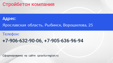 Стройбетон, компания по адресу Ярославская область, Рыбинск, Ворошилова, 25 в дальнейшем Организация, размещена в следующих категориях: