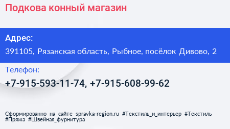 Подкова, конный магазин по адресу 391105, Рязанская область, Рыбное, посёлок Дивово, 2 в дальнейшем Организация, размещена в следующих категориях: