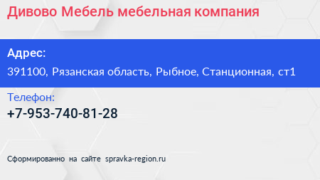 Дивово-Мебель, мебельная компания по адресу 391100, Рязанская область, Рыбное, Станционная, ст1 в дальнейшем Организация, размещена в следующих категориях: