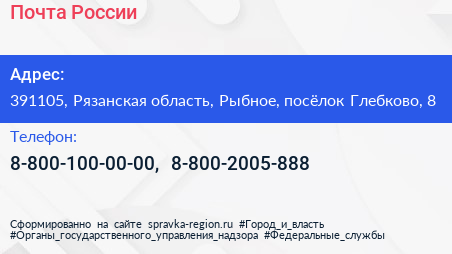 Почта России по адресу 391105, Рязанская область, Рыбное, посёлок Глебково, 8 в дальнейшем Организация, размещена в следующих категориях: