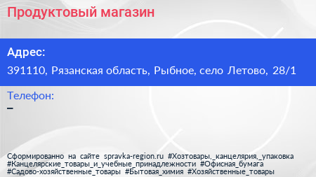 Продуктовый магазин по адресу 391110, Рязанская область, Рыбное, село Летово, 28/1 в дальнейшем Организация, размещена в следующих категориях: