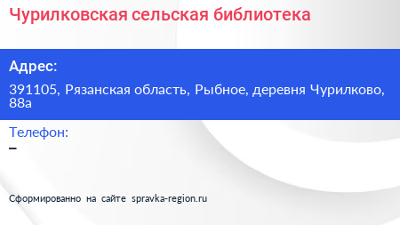 Чурилковская сельская библиотека по адресу 391105, Рязанская область, Рыбное, деревня Чурилково, 88а в дальнейшем Организация, размещена в следующих категориях:
