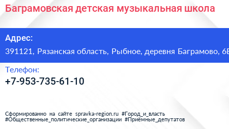 Баграмовская детская музыкальная школа по адресу 391121, Рязанская область, Рыбное, деревня Баграмово, 6Б в дальнейшем Организация, размещена в следующих категориях: