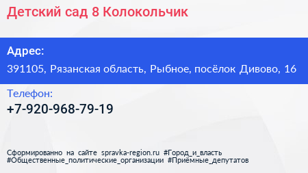 Детский сад №8 Колокольчик по адресу 391105, Рязанская область, Рыбное, посёлок Дивово, 16 в дальнейшем Организация, размещена в следующих категориях: