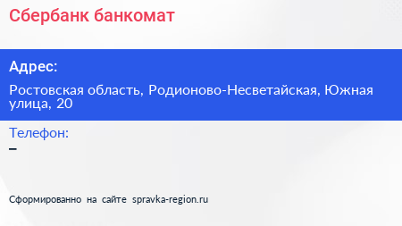 Сбербанк, банкомат по адресу Ростовская область, Родионово-Несветайская, Южная улица, 20 в дальнейшем Организация, размещена в следующих категориях: