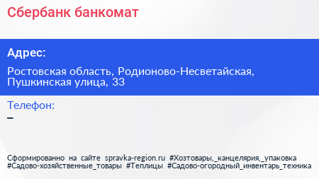 Сбербанк, банкомат по адресу Ростовская область, Родионово-Несветайская, Пушкинская улица, 33 в дальнейшем Организация, размещена в следующих категориях: