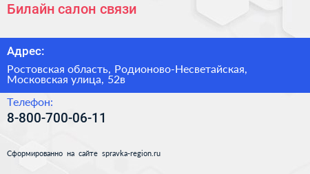 Билайн, салон связи по адресу Ростовская область, Родионово-Несветайская, Московская улица, 52в в дальнейшем Организация, размещена в следующих категориях: