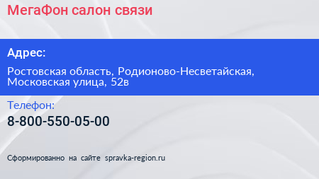 МегаФон, салон связи по адресу Ростовская область, Родионово-Несветайская, Московская улица, 52в в дальнейшем Организация, размещена в следующих категориях:
