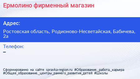 Ермолино, фирменный магазин по адресу Ростовская область, Родионово-Несветайская, Бабичева, 2а в дальнейшем Организация, размещена в следующих категориях:
