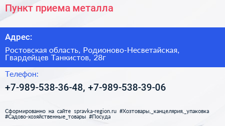 Пункт приема металла по адресу Ростовская область, Родионово-Несветайская, Гвардейцев Танкистов, 28г в дальнейшем Организация, размещена в следующих категориях: