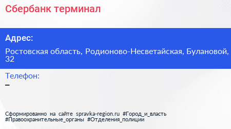 Сбербанк, терминал по адресу Ростовская область, Родионово-Несветайская, Булановой, 32 в дальнейшем Организация, размещена в следующих категориях: