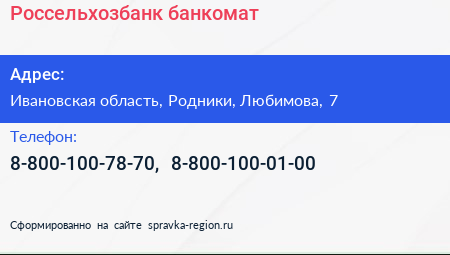Россельхозбанк, банкомат по адресу Ивановская область, Родники, Любимова, 7 в дальнейшем Организация, размещена в следующих категориях: