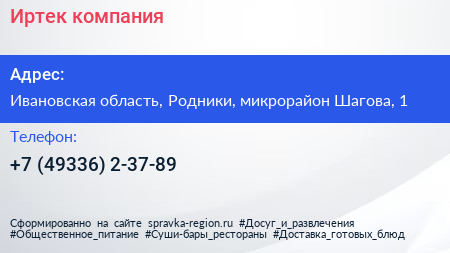 Иртек, компания по адресу Ивановская область, Родники, микрорайон Шагова, 1 в дальнейшем Организация, размещена в следующих категориях: