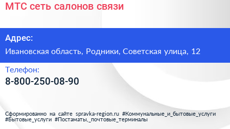 МТС, сеть салонов связи по адресу Ивановская область, Родники, Советская улица, 12 в дальнейшем Организация, размещена в следующих категориях: