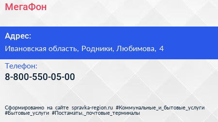 МегаФон по адресу Ивановская область, Родники, Любимова, 4 в дальнейшем Организация, размещена в следующих категориях: