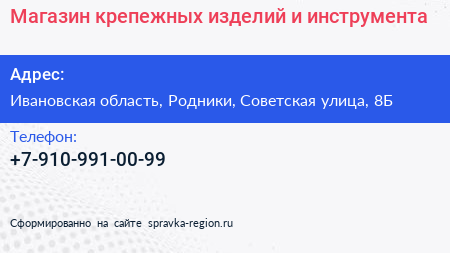 Магазин крепежных изделий и инструмента по адресу Ивановская область, Родники, Советская улица, 8Б в дальнейшем Организация, размещена в следующих категориях: