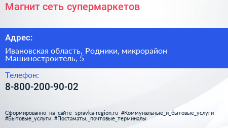 Магнит, сеть супермаркетов по адресу Ивановская область, Родники, микрорайон Машиностроитель, 5 в дальнейшем Организация, размещена в следующих категориях: