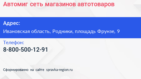 Автомиг, сеть магазинов автотоваров по адресу Ивановская область, Родники, площадь Фрунзе, 9 в дальнейшем Организация, размещена в следующих категориях: